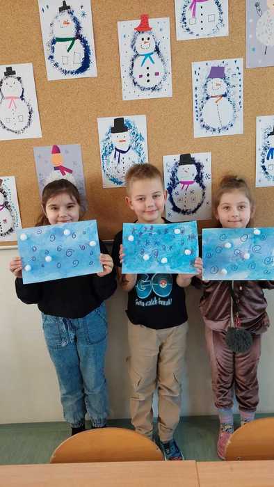 V měsíci únoru se ve družinách ukázala paní ZIMA. Naštěstí jen při výtvarných činnostech. A tak děti tvořily a tvořily. Naučily se tiskat alobalem, vyrábět prostřihované vločky, pomocí igelitu vytvořit ledovou plochu a solí znázornit námrazu na oknech. Stromy před školou vyzdobily ledovými ozdobami s drobnými přírodninami uprostřed.